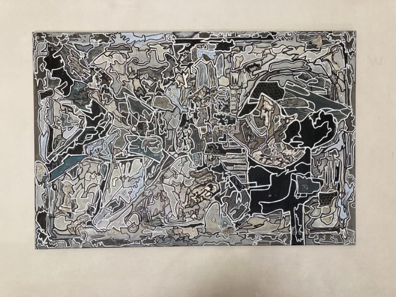 Image: Pareidolia1”, 2024, mixed media on plywood. 2’x3’.